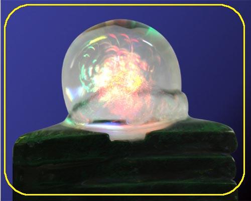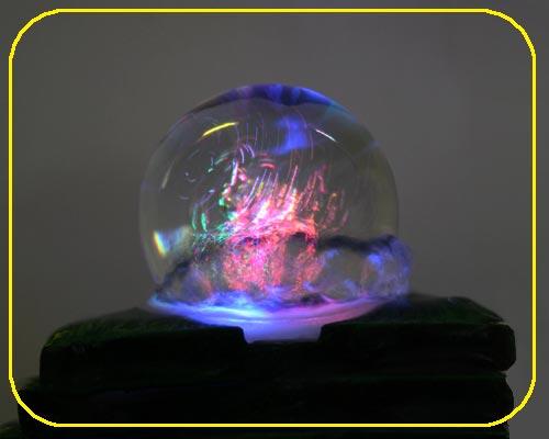 Innenbereich der Treppe in den kleinen Kunststoffbehälter hochgepumpt wird, fängt durch das von unten drückende Wasser die Glaskugel an sich zu drehen. Von unten wird die Kugel durch die am Wasserschlauch befestigte, mit Wechsellicht leuchtenden, LEDs bestrahlt. Die Glaskugel dreht sich nun mit einem langsamen Farbwechsellicht von rot / grün / blau.