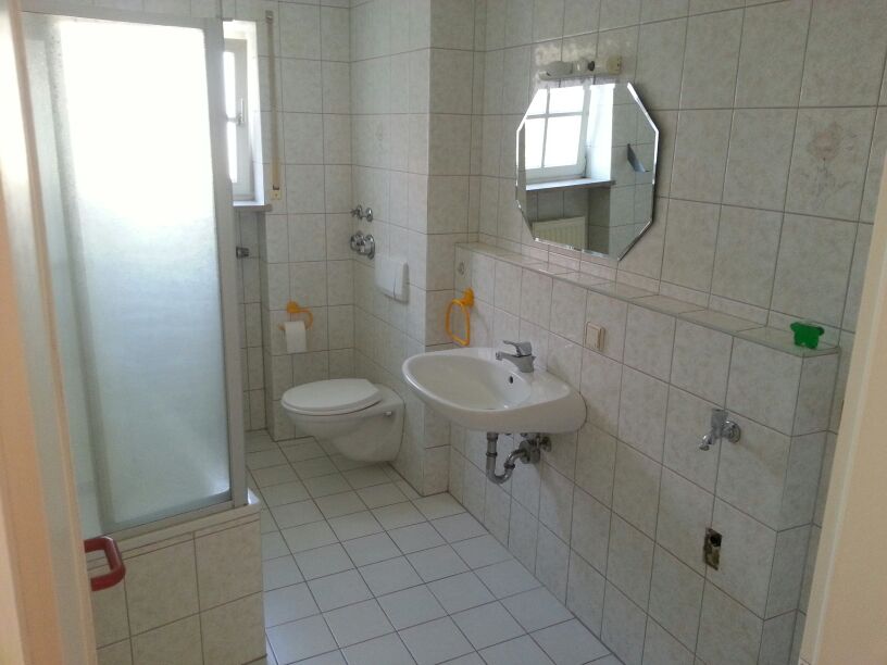 Badezimmer mit Wanne und Waschmaschienenanschluss. Im Oberen Geschoss gelangt man in ein schönes Vorzimmer und von dort aus in ein weiteres Schlafzimmer. Auf der oberen Etage befindet sich zusätzlich noch ein Gäste WC. Zu der Wohnung gehört außerdem ein Keller abteil und bei bedarf die Nutzung des Waschkellers.