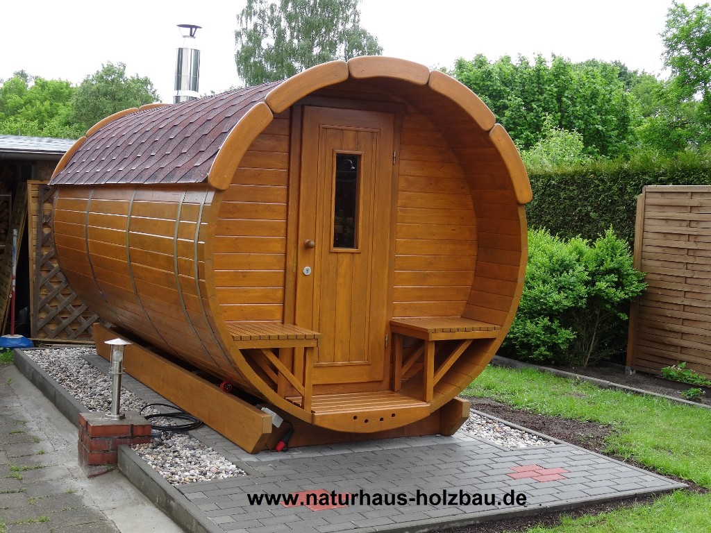 Naturhaus Fasssaunen und Saunapods in massiver 46 mm und 58 mm Wandstärke gewährleisten eine hohe Stabilität und wenig Wärmeverlust, viele Größen und Ausführungen in 1-Raum und 2 Raum