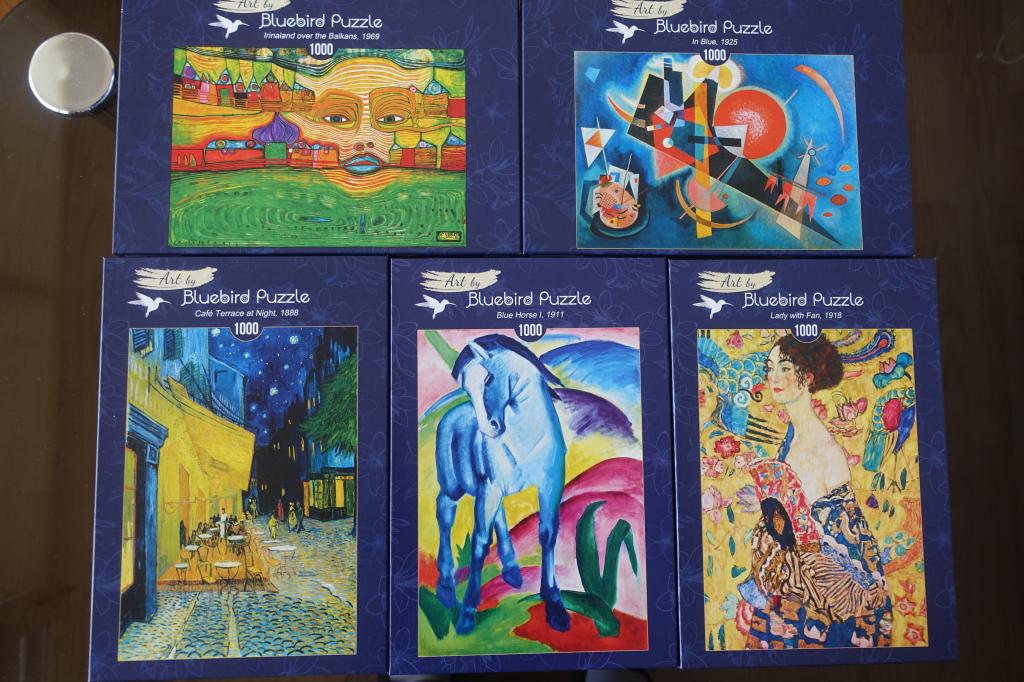 biete 10 Bluebird-Puzzles - je 1000 Teile -Größe 68,3 x 48,0cm Hundertwasser -Irinaland over the Balkas Kandinsky - In Blue Van Gogh - Cafe terrasse at Night Klimt - Lady with Fan Marc Blue