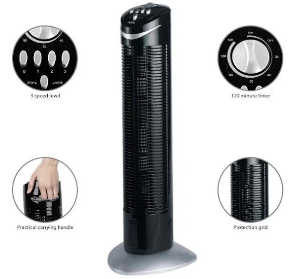 Ventilator-Tower AEG T-VL 5531 in elegantem Schwarz und ästhetisch ansprechend. Der Ventilator verfügt über drei Stufen, in denen die Geschwindiglkeit und somit die Kühlleistung eingestellt werden kann. Es gibt eine Oszillations-Stufe, durch die die kühle Brise auf Wunsch in einem Winkel von 90 Grad (!) erfrischt. Mit Timer-Funktion. Privatverkauf ohne Gewähr, Garantie und Rücknahme. Preis zusammen 60 Euro zzgl. Versandkosten