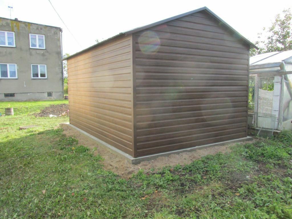 Wir bieten Ihnen hier: 3x5 holzverkleidete Blechgarage mit Satteldach und Schwingtor an.
