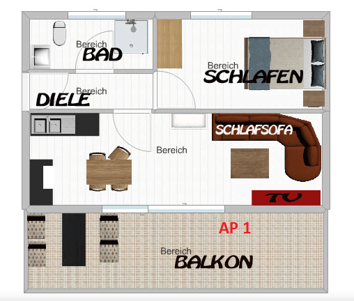 Ausgestattet mit Essgelegenheit Innen für 4 Personen, die Küche ist komplett Eingerichtet mit Geschirr, Besteckt, Teller, Topfe, Kaffemaschine, Wasserkocher, Kühlschrank mit Gefrierfach.