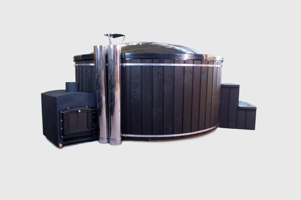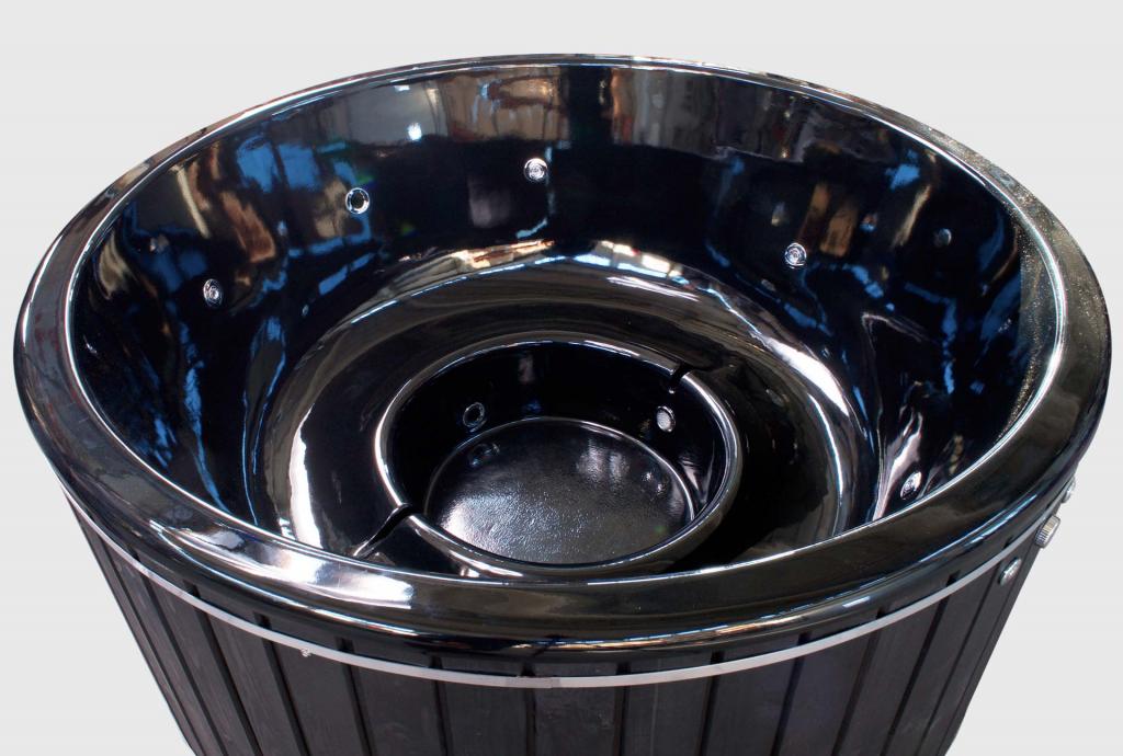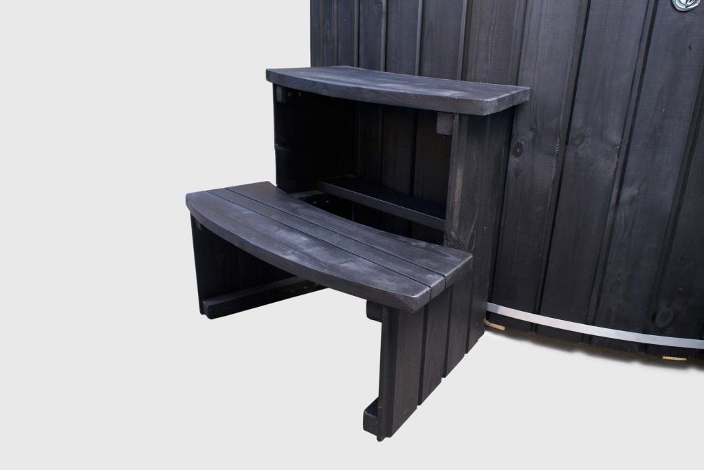 Der Whirlpool ist mit schwarz lackiertem Kiefernholz verkleidet.