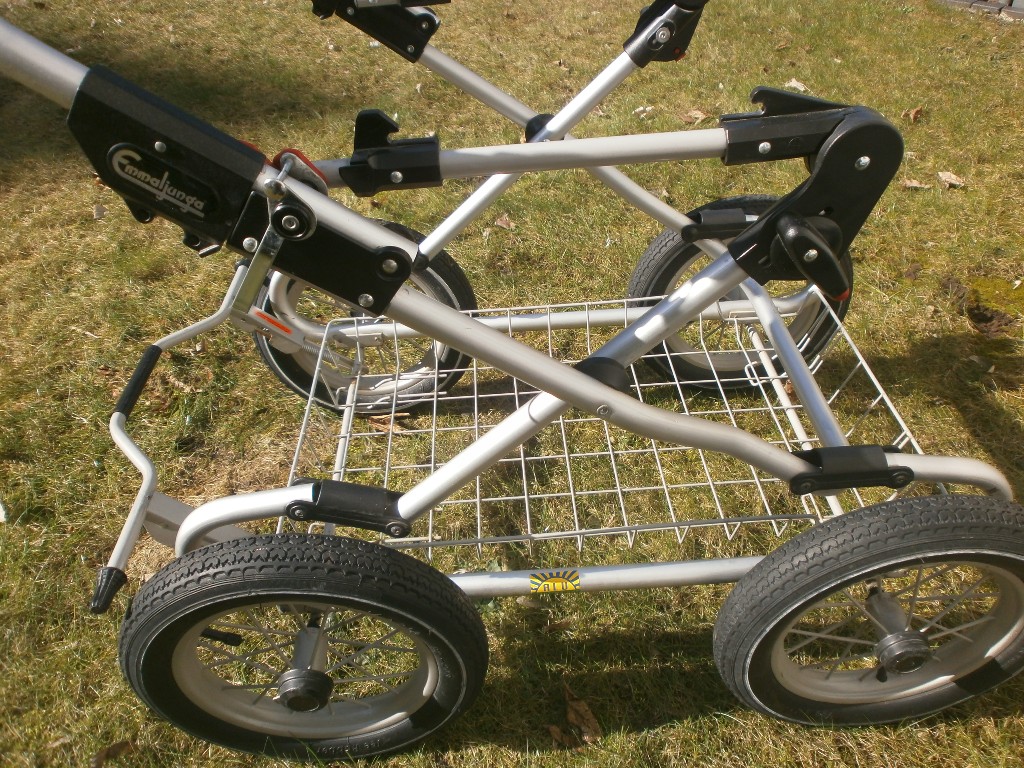 Ein sehr stabiles, mehrfach ausgezeichnetes und schmales Gestell mit umsetzbarem Sitzteil und geräumigen Metallwarenkorb. Der Schieber ist höhenverstellbar und mit der patentierten einstellbaren Federung E.A.S.T. kann der Wagen an das Gewicht des Kindes und den Untergrund angepasst werden. Wird mit Emmaljungas eigengefertigten kugelgelagerten schwarzen Luftreifen ausgeliefert.