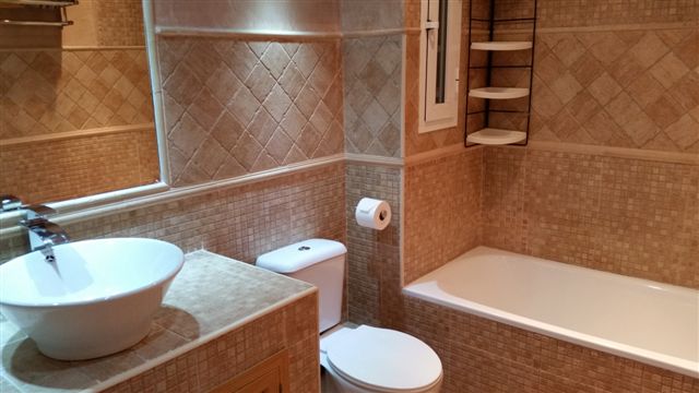 Das Badezimmer verfügt über eine Badewanne, WC und Waschbecken mit Unterschrank und kann über eine separate Elektroheizung temperiert werden.