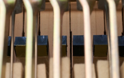 Vergleich zu anderen Mark 1 – Pianos, die ich hier auf Ebaygesehen habe, macht es aber einen fürsein Alter ordentlichen Eindruck und kann als gut erhalten beschrieben werden.An einigen Hämmerchen sind mehr oder wenige starke Gebrauchsspuren zu erkennen.Das Gerät hat die klassische Holztastatur; die Tasten sind im Vergleich zuheutigen Keyboard- oder Piano-