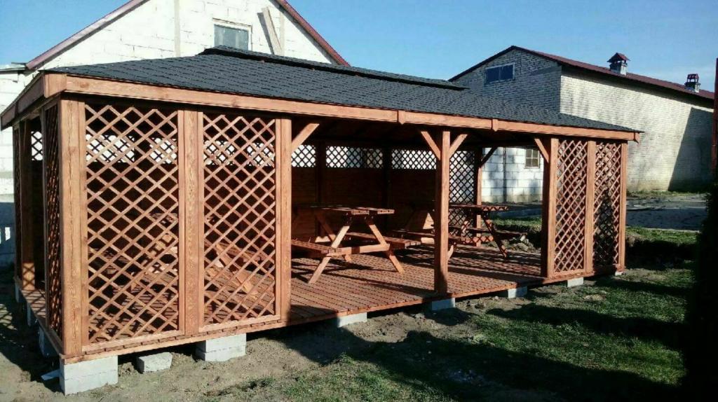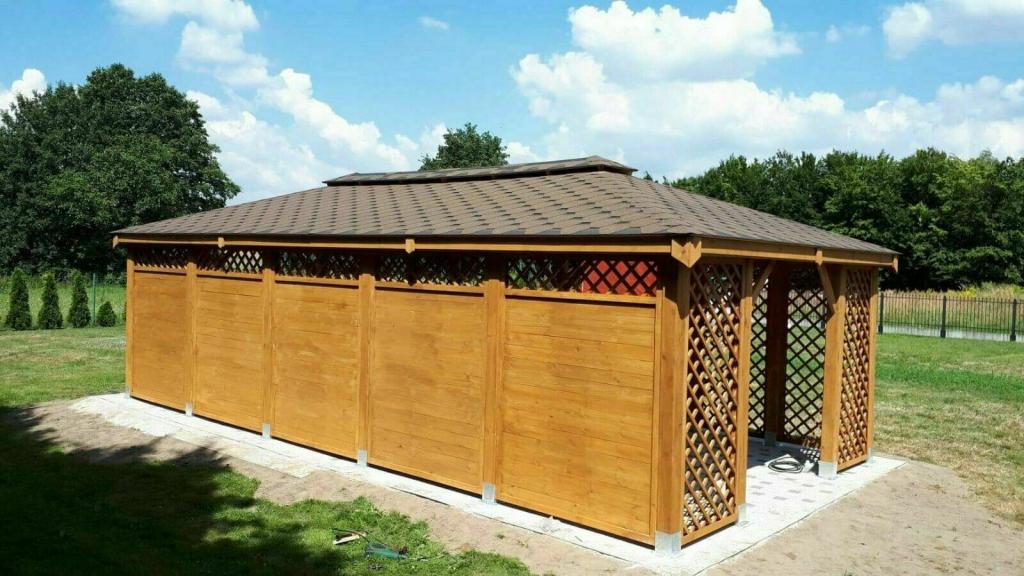 Dimensionen 4m x 8m zu kaufen. Die Laube wird aus Kantholz aus Kieferholz herausgestellt. Die ganze Wandkonstruktion wird mit Holzschutz Drewnochron in von Ihnen ausgewählter Farbe imprägniert: Grün, Japanische Kirschfarbe, Wenge, Tik, Grau, Naturkiefer, Kiefer, Mittel Palisander, Palisander, Dunkle Nuss, Dunkle Eiche, Eiche und Zeder.