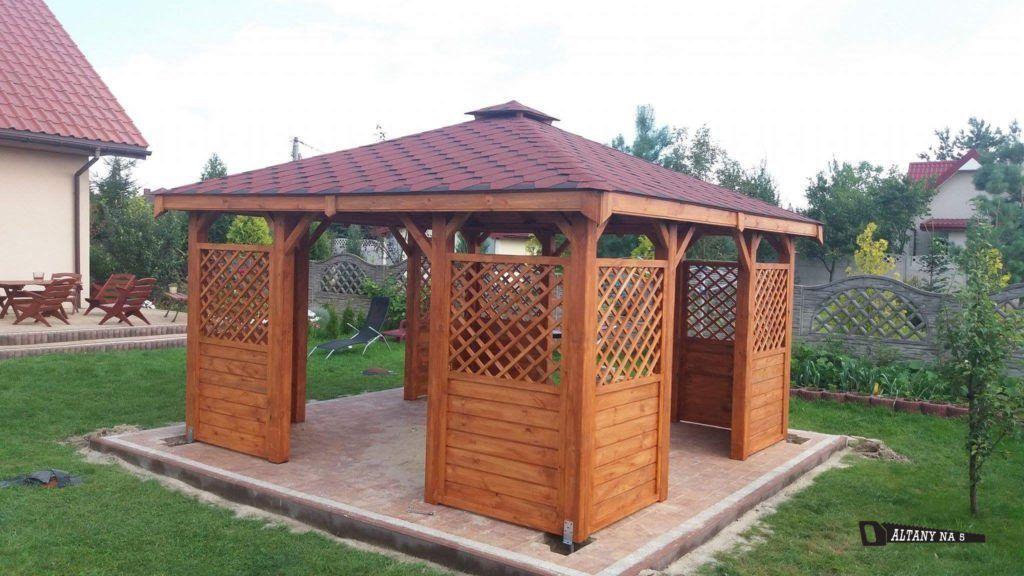 Wir laden Ihnen ein, eine schöne Holzgartenlaube aus Kiefer -und Fichtenholz zu kaufen. Die Laube wird aus Kiefernholz herausgestellt. Die ganze Konstruktion wird auf Tragsäulen gestützt. Das Holz wird mit Holzschutz Drewnochron in jeder ausgewählter Farbe imprägniert, Musterkatalog auf eines der Bilder. Die angebotene Konstruktion besitzt drei offene Wände, und eine Wand, die komplett bebaut ist.