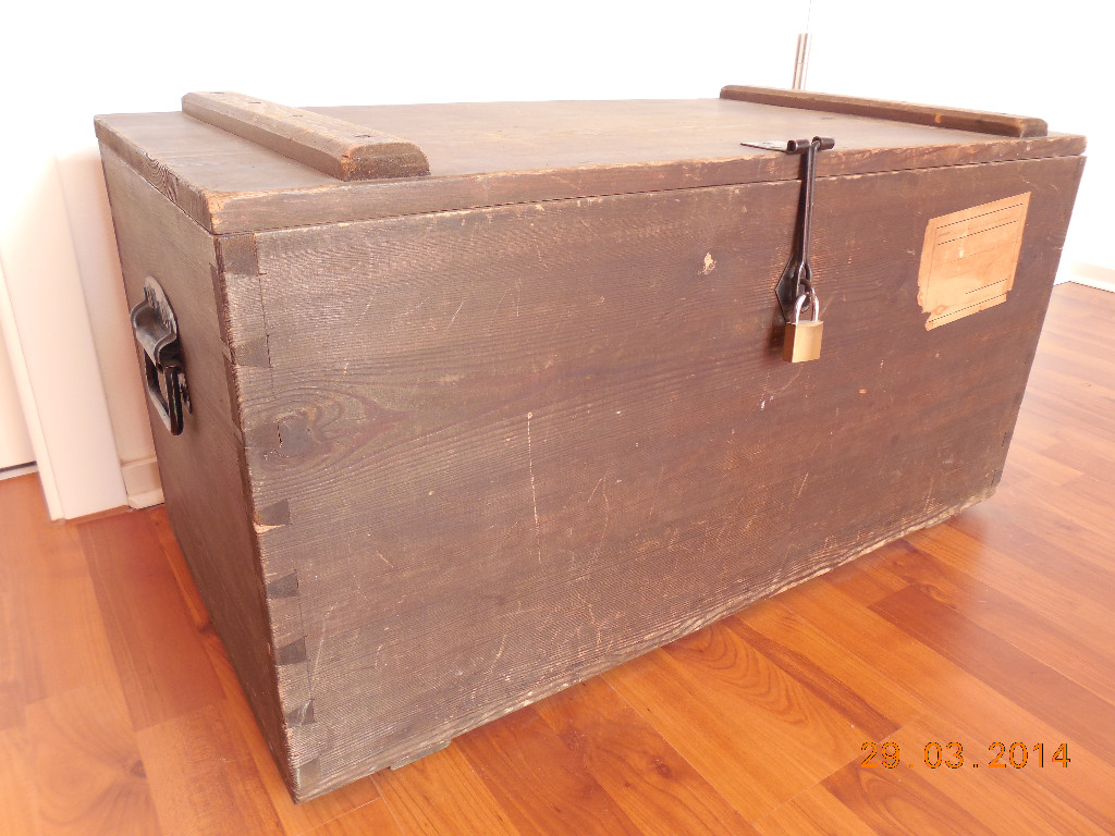 Stabile Holzkiste mit Querverstrebungen von 1950! Aus russischer Kriegsgefangenschaft mit gebracht. 2 Metall Tragegriffe. Schließbügel.
