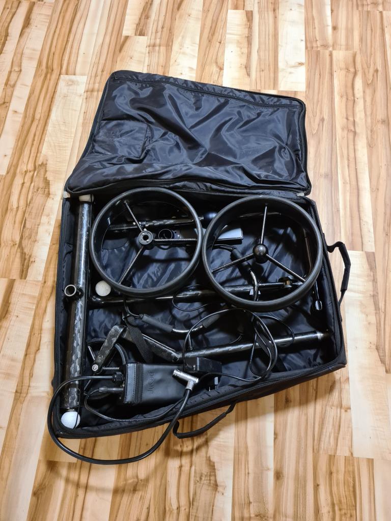 Bewegung gesetzt, Distanzeinstellungen 10-20-30Meter, mit Traveltasche inkl. Rollen. Neue Reifen und neuer Akkupack in 2021, neue Motoren und Service bei Jucad in 10/2022. inkl. Scorekartenhalter.