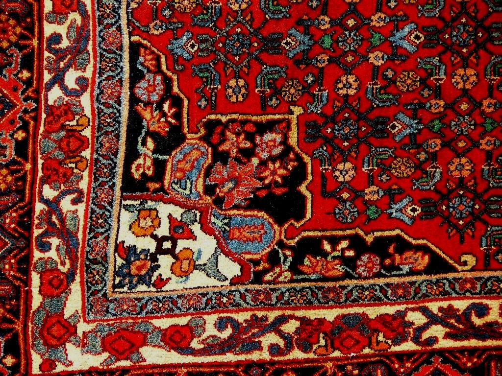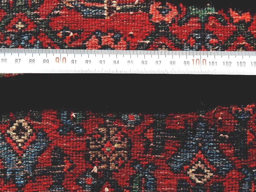 Bemerkungen: Dieser Teppich zählt zu den strapazierfähigsten überhaupt. Dichter bürstenartiger Flor, doch geschmeidig im Griff, ähnlich wie ein dickes Leder. Diese Art von Bidjar-Teppichen wird von Kurden geknüpft, die für Ihre äußerst haltbaren Teppiche berühmt sind. Heute werden diese Teppiche so nicht mehr hergestellt, sie wären bei diesem Aufwand, wegen der gestiegenen Lohnkosten kaum noch zu verkaufen.
