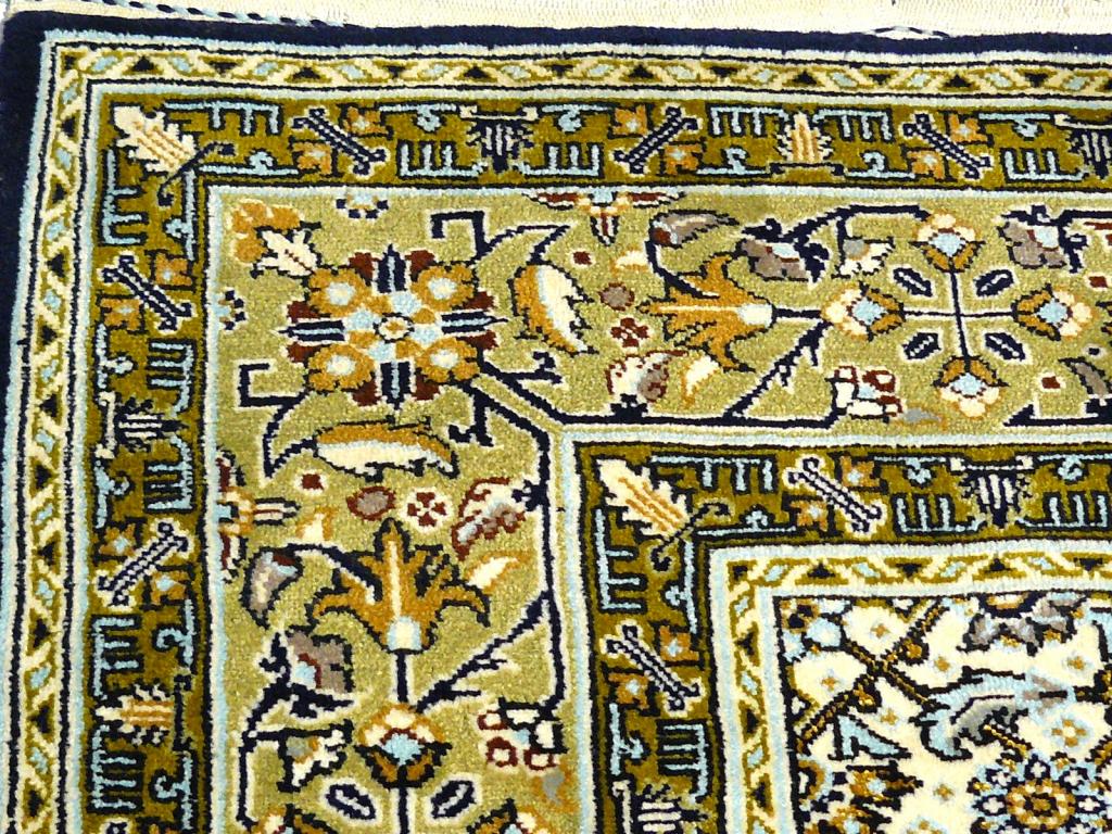 Bemerkungen: Die meisten billigen Ghom, die angeboten werden sind Kopien aus Indien und Pakistan, sie werden aus billiger Importwolle in großen Mengen hergestellt. Originale gehören zum Besten was die orientalische Knüpfkunst zu bieten hat. Dieser hier ist nie begangen worden, er ist so gut und dicht verarbeitet, dass der optische Eindruck ihn wie eine Fläche aus Samt wirken lässt. Sehr strapazierfähig. Die Konturen der Muster sind aus Seide, dadurch wird der exklusive Gesamteindruck noch verstärkt. Spitzenwolle kostet wesentlich mehr als Seide.. Die "Originalität, Alter, Qualität, Zustand und der künstlerische Aspekt sind die wesentlichsten Faktoren bei der Bewertung eines Teppichs". (Heute gilt die Faustregel für neue Ware der klassischen Iranischen Provenienzen, 1 Million Knoten kosten 10.000 € im Ursprungsland).