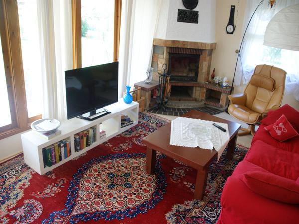 Wohnzimmer: gemütliche Sitzgarnitur, Kamin (Holz inklusive), Flachbildfernseher