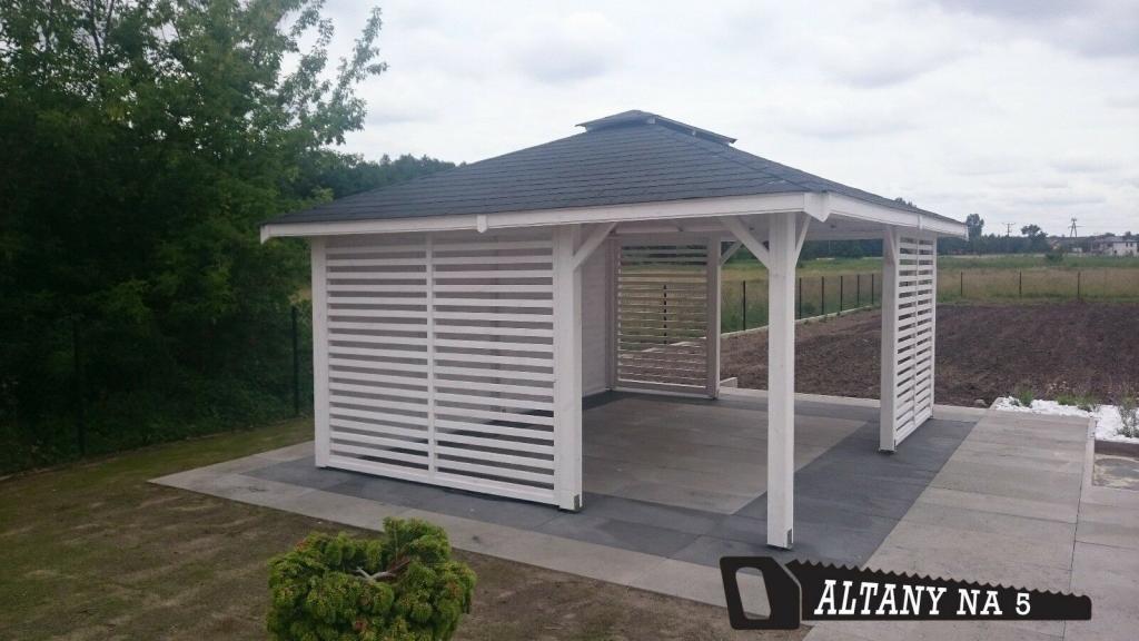 Wir laden Ihnen ein, eine schöne Holzgartenlaube aus Kiefer -und Fichtenholz zu kaufen. Die Laube wird aus Kiefernholz herausgestellt. Die ganze Konstruktion wird auf Tragsäulen gestützt. Das Holz wird mit Holzschutz Drewnochron in jeder ausgewählter Farbe imprägniert, Musterkatalog auf eines der Bilder. Die angebotene Konstruktion besitzt drei offene Wände, und eine Wand, die komplett bebaut ist.