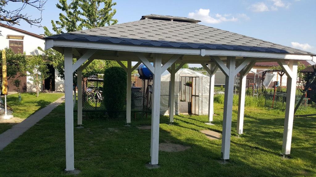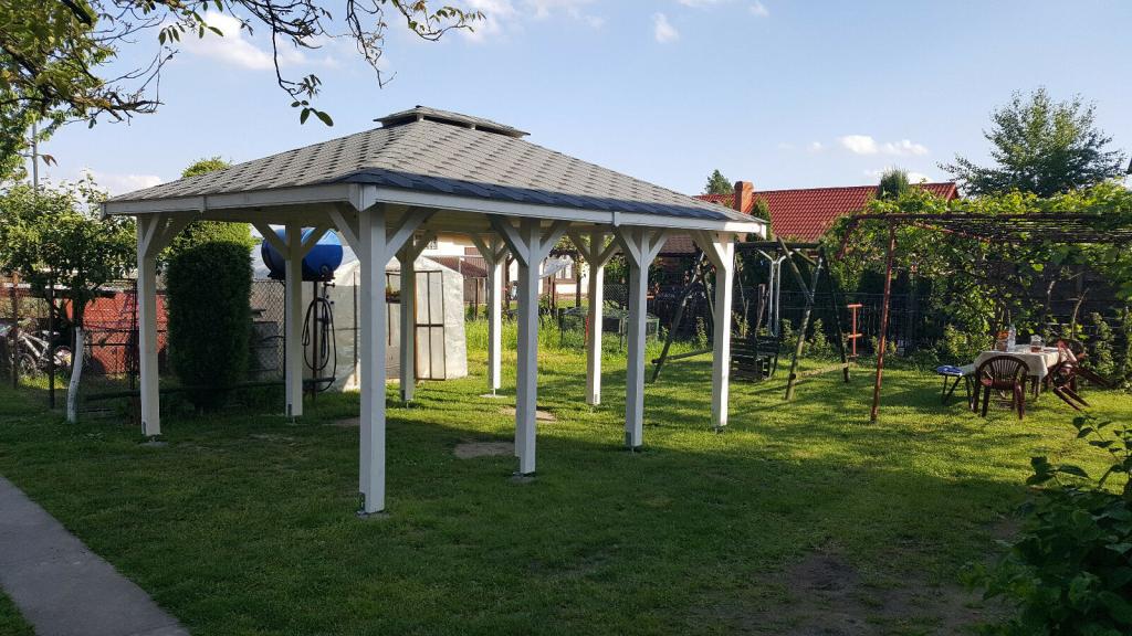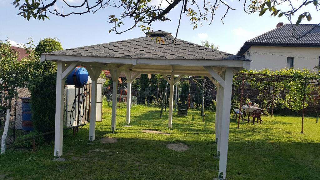 Dimensionen 3,5 m x 4,5 m zu kaufen. Die Laube wird aus Kantholz aus Kieferholz herausgestellt. Die ganze Wandkonstruktion wird mit Holzschutz Drewnochron in von Ihnen ausgewählter Farbe imprägniert: Grün, Japanische Kirschfarbe, Wenge, Tik, Grau, Naturkiefer, Kiefer, Mittel Palisander, Palisander, Dunkle Nuss, Dunkle Eiche, Eiche und Zeder.