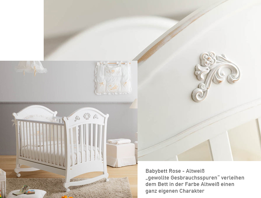 Dieses schöne Babybett bezaubert durch seine liebevolle Gestaltung und aufgesetzten Holzornamente an der Außenseite.Das Kinderbett Rose aus unserem Onlineshop wirkt sehr romantisch, besonders in Kombination mit der dazu passenden Kommode Tulip. Sowohl Kinder Kommode Tulip als auch Babybett Rose sind in 3 verschiedenen Farben erhältlich.
