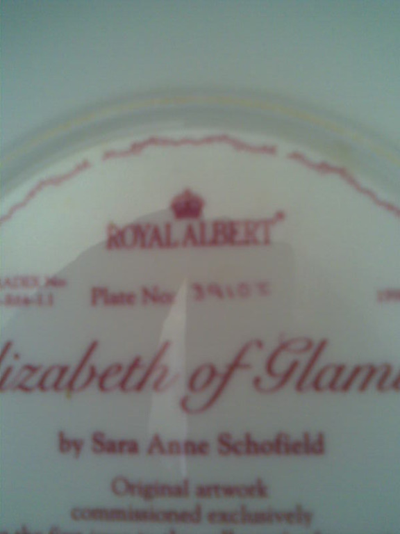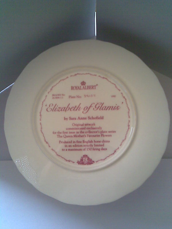 Teller, Royal, Albert, Elizabeth, glamis, Schofield, Sara Anne Schofield, Queen Mum, Favourite Flowers, 1990, bone china, Bradex No 26-R64-1.1, Plate No 3910 I, Goldrand, Sammlerwelt24, Raritaet56, kleine-abtei, sammler, Sammlerboerse, sammler.net, sammler-info, Kevelaer