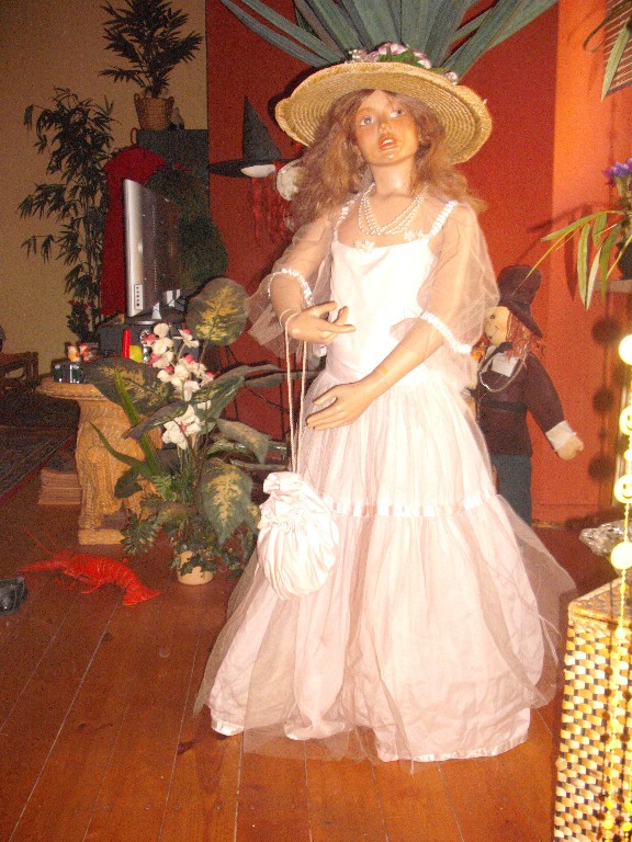 Eine 1,27 m große Schaufensterpuppe die mit Antiken Kleidern angezogen ist,
