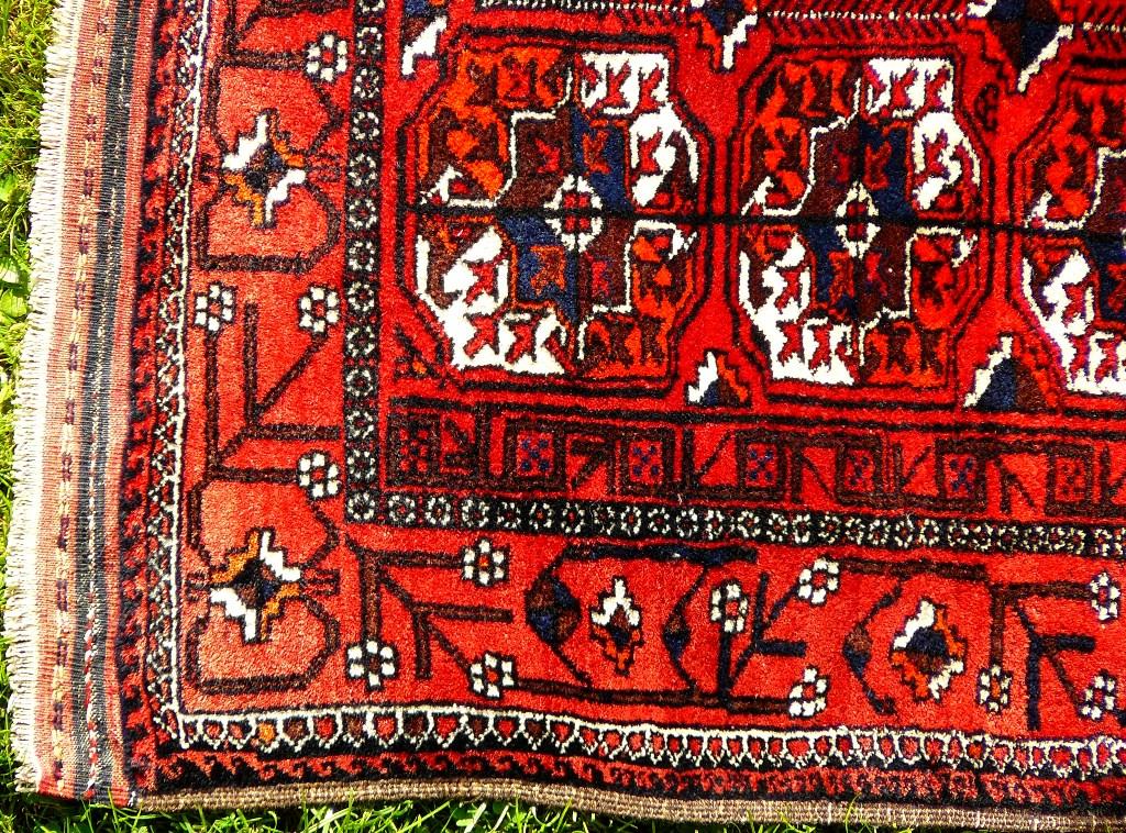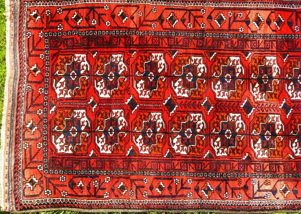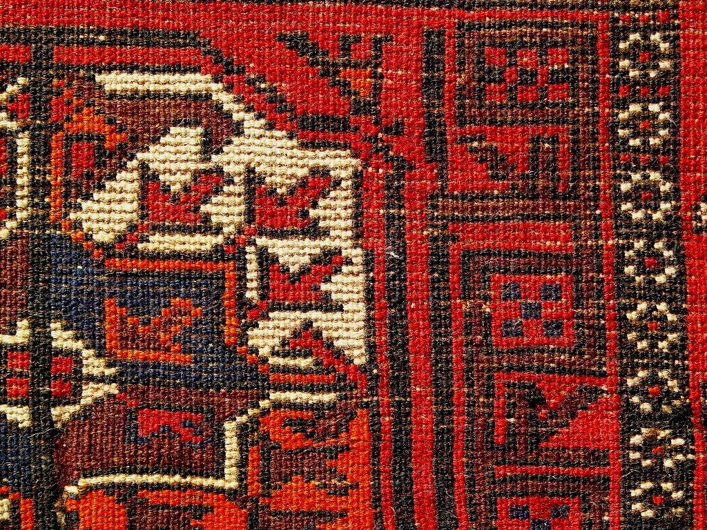 Bemerkungen: Folkloristisch wirkender Nomadenteppich, wurde ursprünglich zum eigenen Gebrauch hergestellt. In dieser Musterkombination mit Hauptmotiv der Tekke-Nomaden. Selten, weil die in dieser Gegend gar nicht leben. Alte gut erhaltene Stücke sind kaum noch zu finden, wichtig ist hier die Originalität und der Erhaltungszustand.