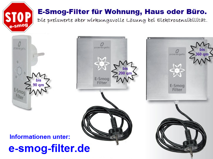 • Aus persönlicher Erfahrung empfehle ich zum Schutz vor Elektrosmog in Wohnung, Haus oder Büro als ersten ganz einfachen Schritt die Anbringung eines E-Smog Filters von Proenergetic.