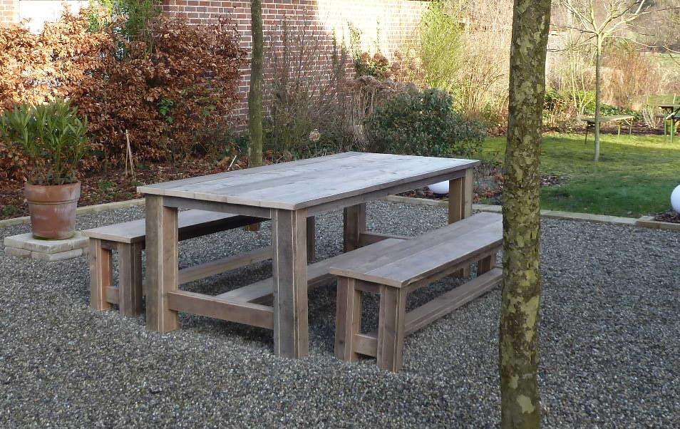 Modell Gera ist baugleich mit unserem Tisch Gera. Die Bank steht auf vier Beinen, die durch Querverstrebungen verbunden sind und der Bauholz