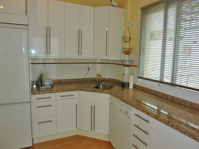 Der Essbereich ist nur wenige Schritte von der Küche entfernt. Am großen Esstischen stehen vier Stühle. Die Komfortküche ist komplett ausgestattet: Geschirrspülmaschine, Cerankochfeld, Backofen mit Elektrogrill, Kaffeemaschine, Toaster, Heißwassergerät, Kühl-/ Gefrierkombination und vieles mehr.