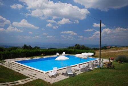 Anwesens mit Wäldern, Gemüse- und Weinanbau, Olivenöl-, Honig- und Marmeladenproduktion und Kleinviehhaltung. 100m unterhalb verläuft eine wenig befahrene Landstraße. Schöne Sicht auf das umliegende Tal. Swimmingpool in sonniger Lage; weitläufige schattige Bereiche mit Grill neben dem Haus. Möglichkeit zu Spaziergängen oder
