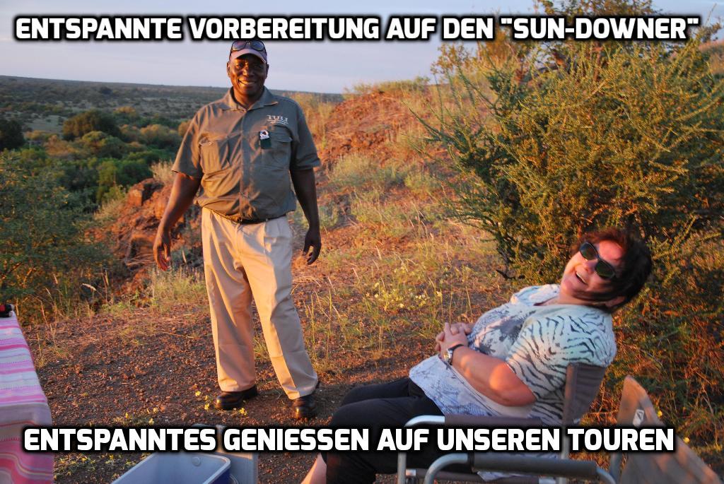 Bevölkerung von "Low Budget" bis 5-Sterne-Luxus ist alles möglich. Wir selbst reisen nach dem Motto irgendwo dazwischen. Es braucht keinen "Butler" im Nationalpark, wenn man hier den Schwerpunktauf die Natur und Tierbeobachtungen legt. Es braucht nicht immer (auch wenn es "zwischendurch" mal toll ist) ein grandioses 5-Gänge-Menue im Bushveld, wenn es Selbst-gegrilltes mit Löwengebrüll oder Hyänengeheule unter dem tollen Sternenhimmel gebenkann.