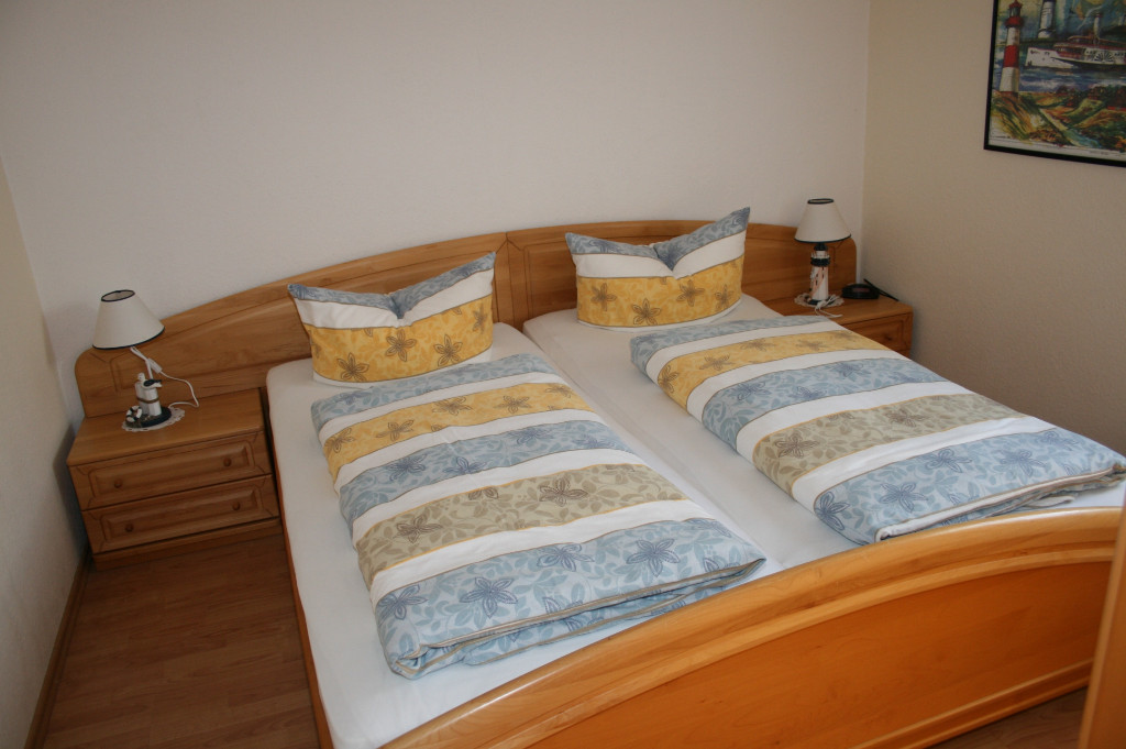 Doppelbett (Liegefläche: 1.80 m x 2.00 m) mit verstellbaren Lattenrosten, Nachtkonsolen und einem großen 2türigen Kleiderschrank. Das zweite Schlafzimmer in heller Ahorn-Ausführung besteht aus einem Komfortbett (Liegefläche: 1,40 m x 2,00 m) und einem Einzelbett (Liegefläche: 1,00 m x 2,00 m) mit Nachtkonsolen, einem großen 2türigen Kleiderschrank, eine Schubladenkommode und ein Kommodenschränkchen, zweites Farb-TV und zusätzlichem DVD-Player, Wandspiegel.