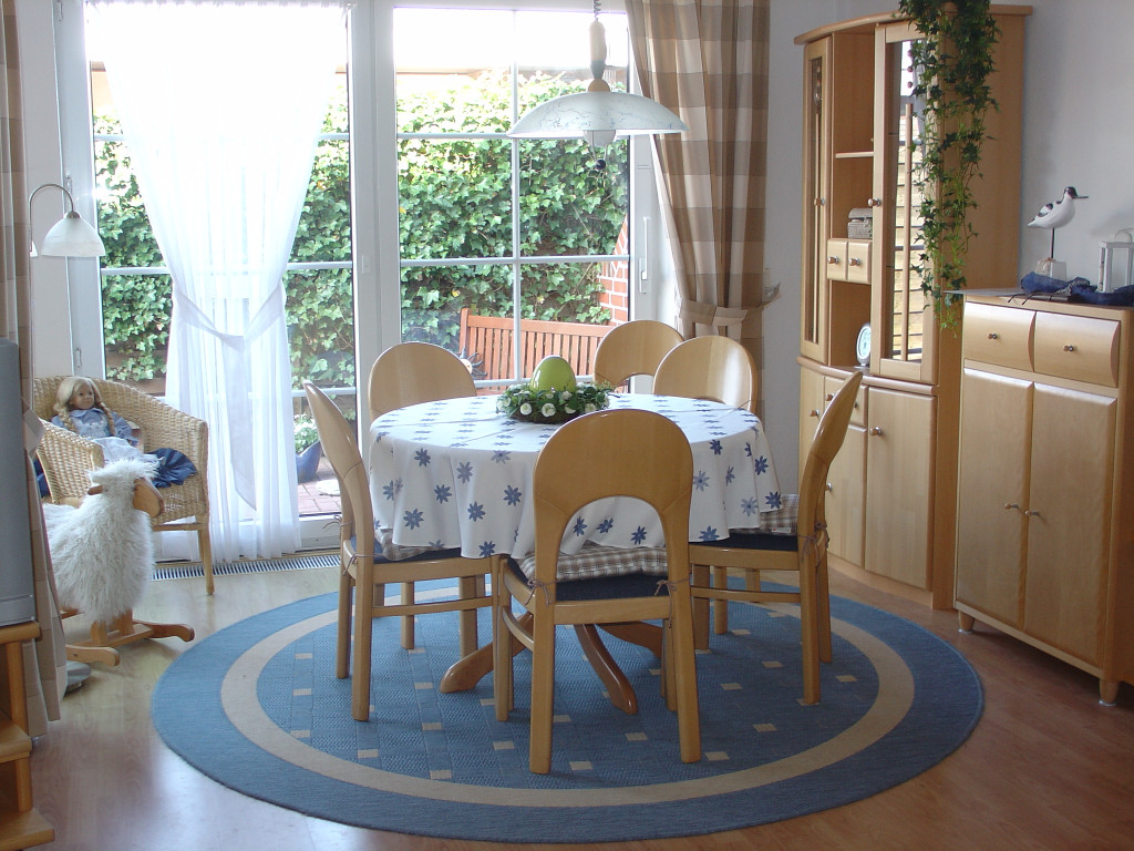 Der Wohnraum ist mit einer modernen, sehr komfortablen Sitzgruppe und einem Relax-Sessel ausgestattet. In unserer Wohnung finden Sie neben einem LCD-TV Fernseher (107er) mit DVD-Player auch eine Micro-Stereo-Anlage. Die Essecke mit 6 Stühlen ist wunderschön hell, so dass Sie schon die ersten Sonnenstrahlen beim Frühstück genießen können.