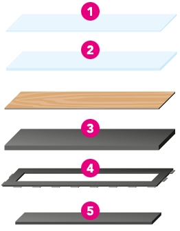 3. Ein solider Rahmen aus Schwarzem PVC dient als Gussform, in der die darüber liegenden Schichten eingelassen sind, und stellt zudem die Verbindung zur Klickbasis dar.