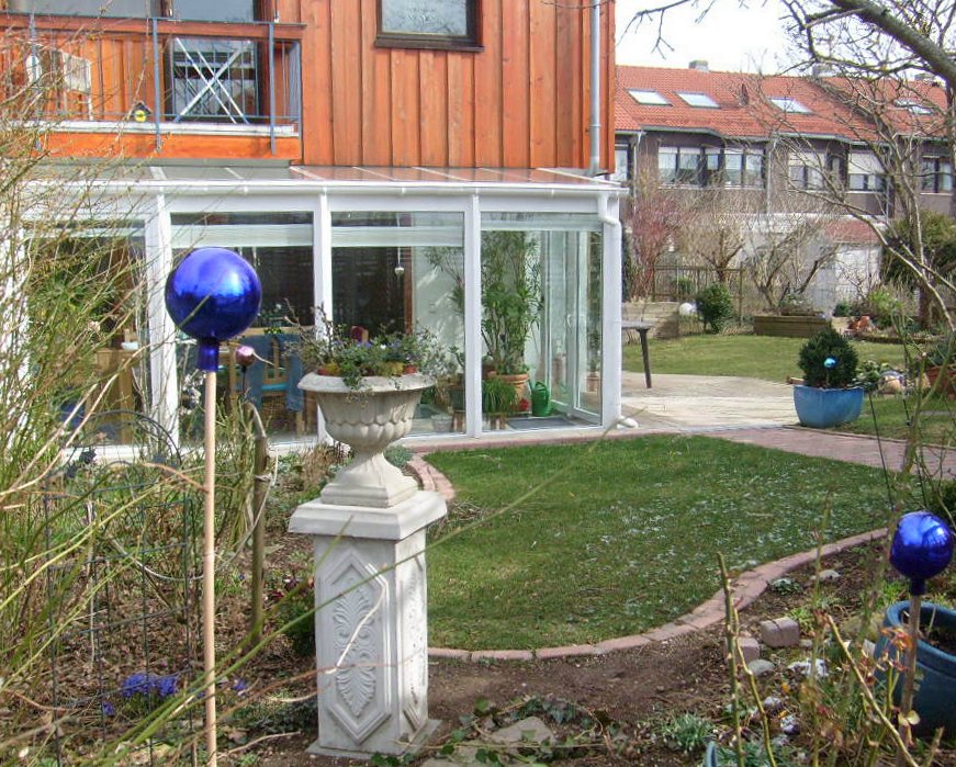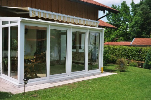Wintergartenprofile Farbe weiß. Festestehende-Fenster-Türen-Elemente bestehen aus PVC mit verzinkter Stahlversteifung .-. Speziell geformte Versteifungseisen in Stock und Flügel ergibt höchste Stabilität. Schöne Außenansicht durch schräge Flügel, und abgerundete Profile, sowie ein ansprechendes Design.