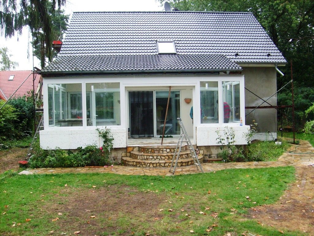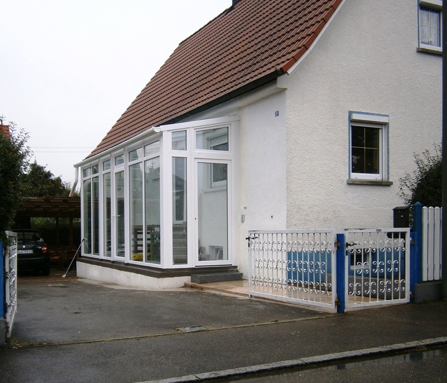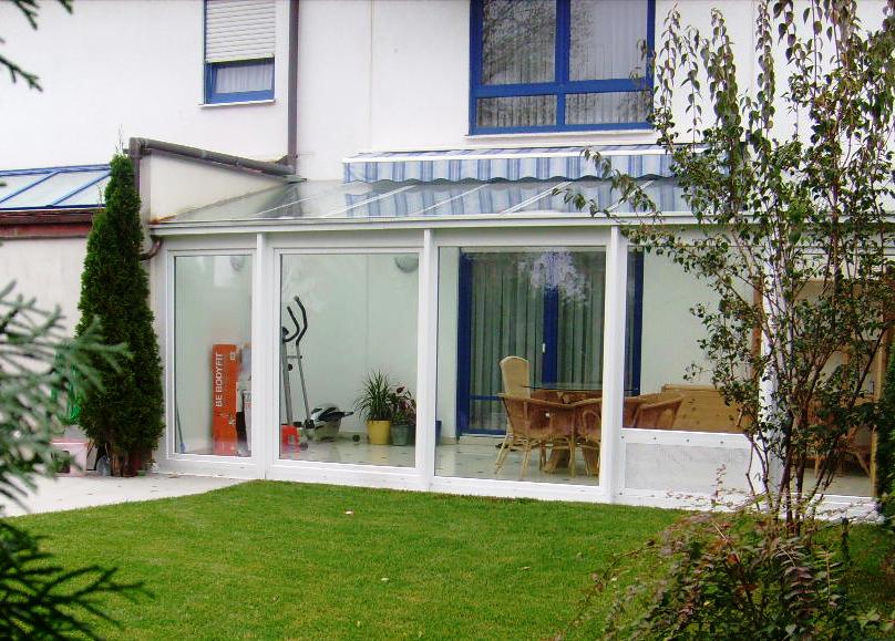 Wintergartenprofile Farbe weiß. Festestehende-Fenster-Türen-Elemente bestehen aus PVC mit verzinkter Stahlversteifung .-. Speziell geformte Versteifungseisen in Stock und Flügel ergibt höchste Stabilität. Schöne Außenansicht durch schräge Flügel, und abgerundete Profile, sowie ein ansprechendes Design.